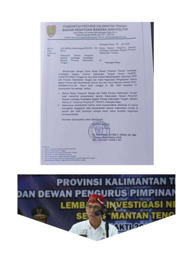 Menurut Wiratmoko, fakta hukum ini bukan informasi baru. Bahkan, DPD Lembaga Investigasi Negara Kalimantan Tengah sudah menyampaikan pemberitahuan resmi kepada Kesbangpol Provinsi Kalimantan Tengah pada 28 Juli 2025.