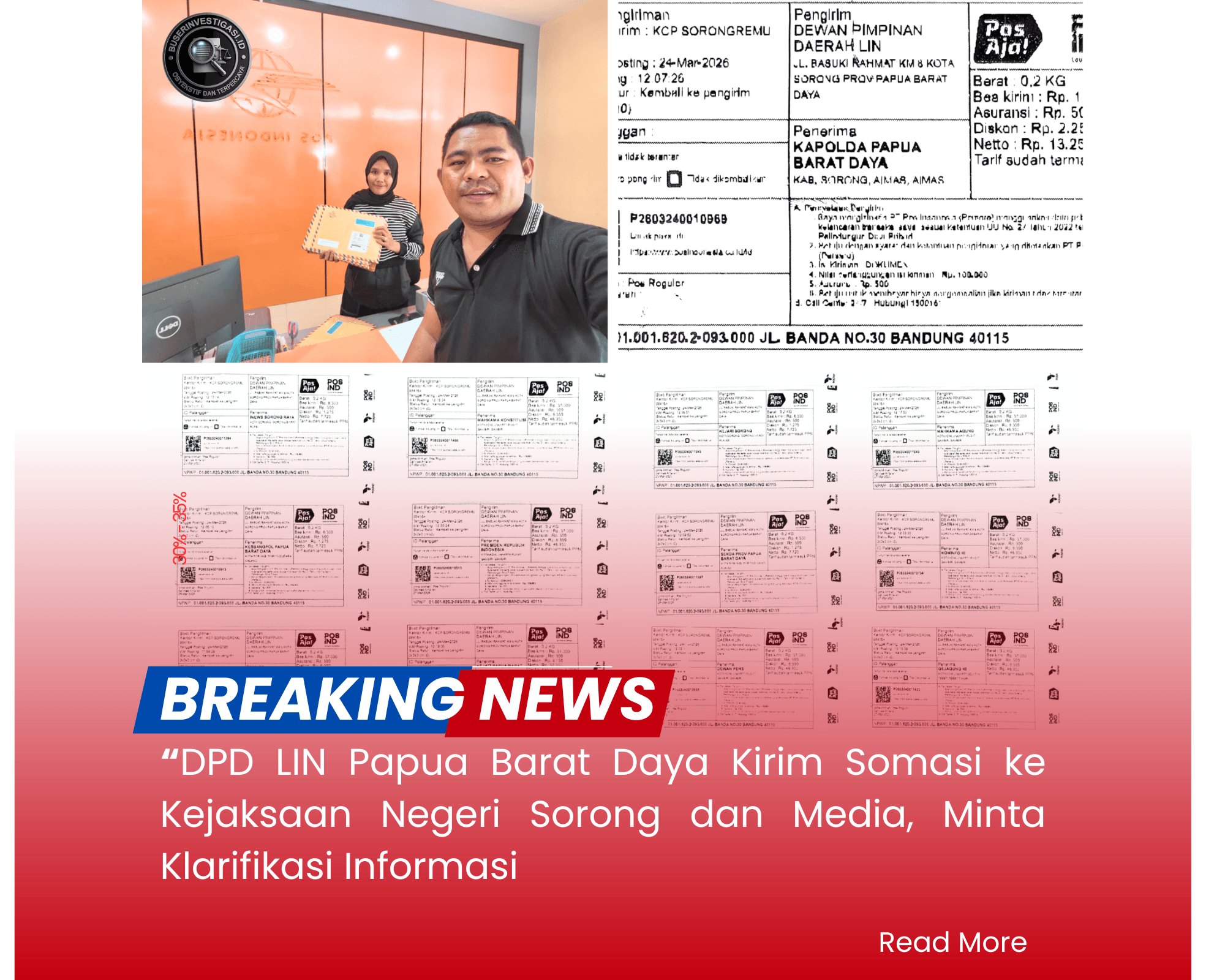 SORONG ll Dalam upaya untuk memperjuangkan kebenaran dan transparansi, DPD LIN Papua Barat Daya yang di Nahkodai Bro JACKSON telah meluncurkan somasi kepada 2 media dan Kasi Kejaksaan Negeri Sorong. Somasi ini terkait dengan dugaan penyebaran berita palsu dan informasi yang tidak akurat tentang PUSKESMAS AIFAT Maybrat yang sedang di awasi oleh LIN karena berita, foto tidak sesuai dengan Fakta di lapangan