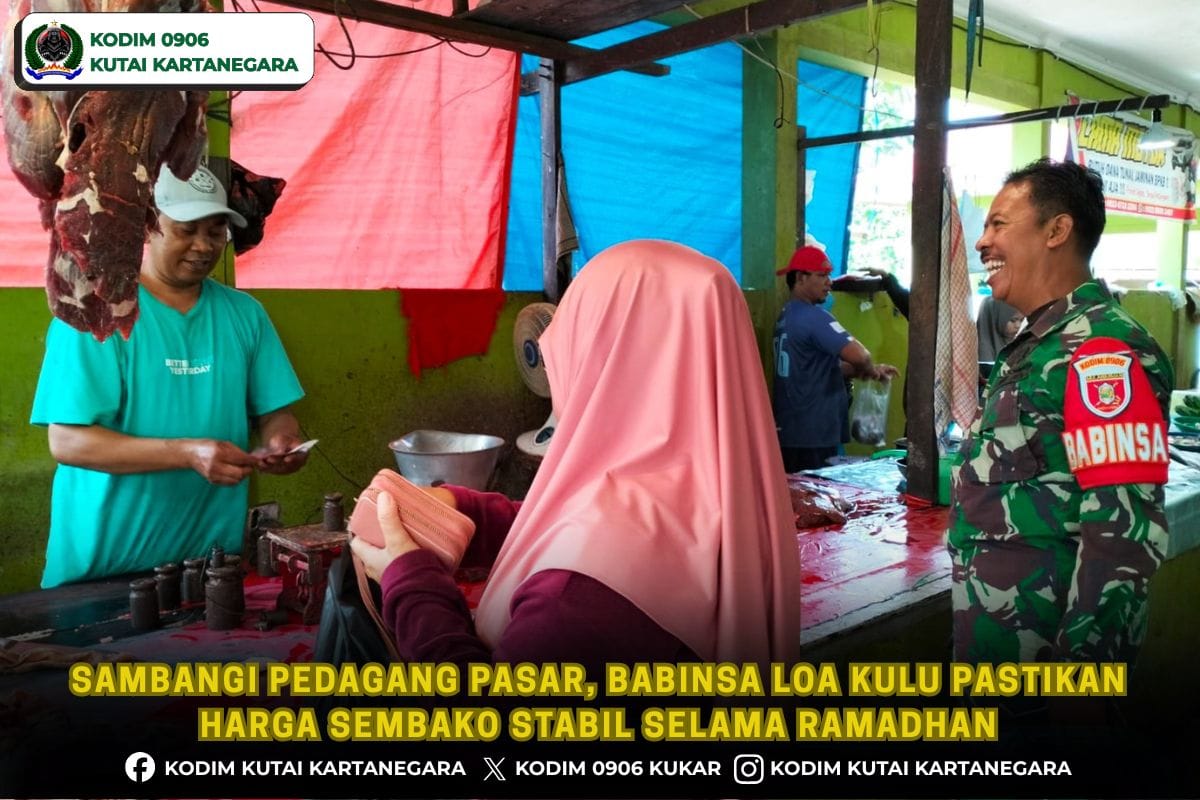 Kutai Kartanegara, pemburukriminal– Guna mengetahui perkembangan harga kebutuhan pokok selama bulan suci Ramadhan, Babinsa Koramil 0906-02/Loa Kulu, Serka M. Yusuf melaksanakan kegiatan pemantauan harga sembako dengan menyambangi para pedagang di pasar tradisional Loa Kulu yang berada di Jalan S. Parman Desa Loa Kulu Kota Kecamatan Loa Kulu, Kamis (26/2/2026).